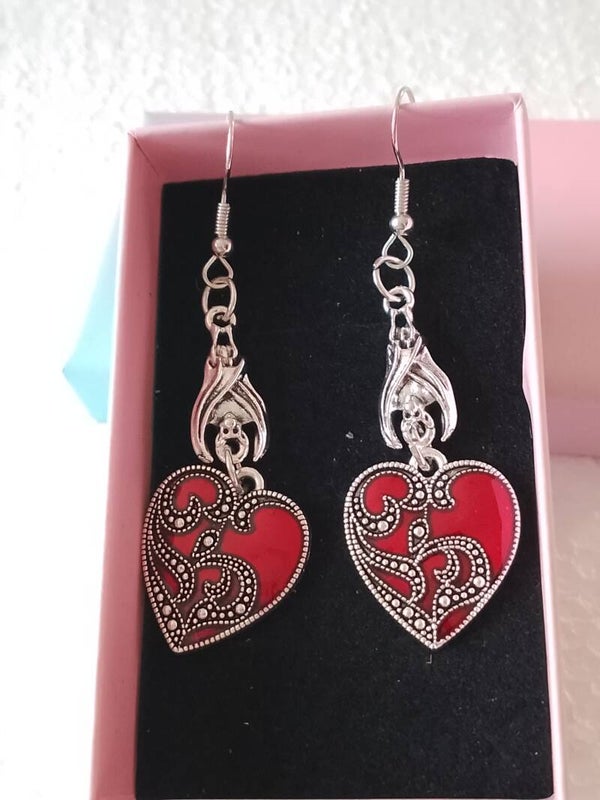 Ein schönes Geschenk zum Valentinstag für Retro Fans. Die Ohrringe sind aus einer Legierung und Emaille. Sie sind vom Haken bis Herz Spitze ca 7 cm lang