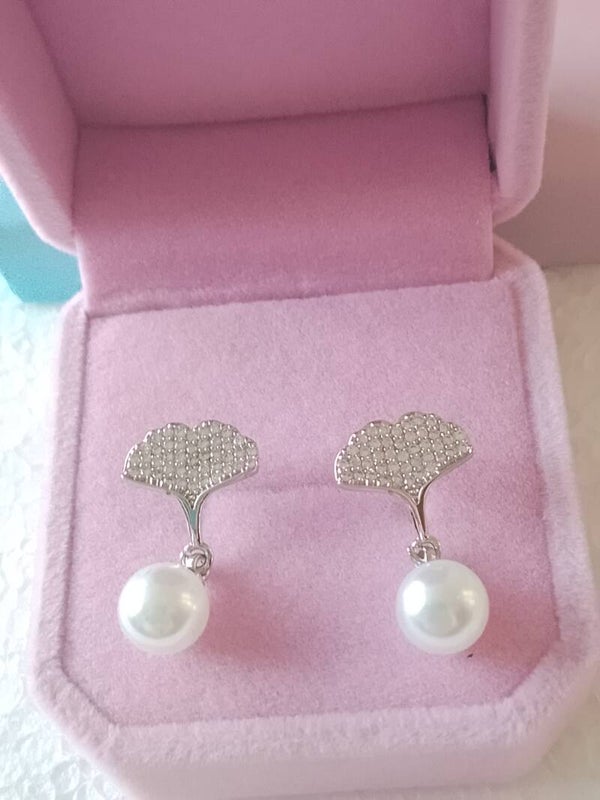 Ginko-Blatt Ohrringe aus Titan-Edelstahl. Besetzt mit winzigen Zirkon. Unten eine Kunstperle.