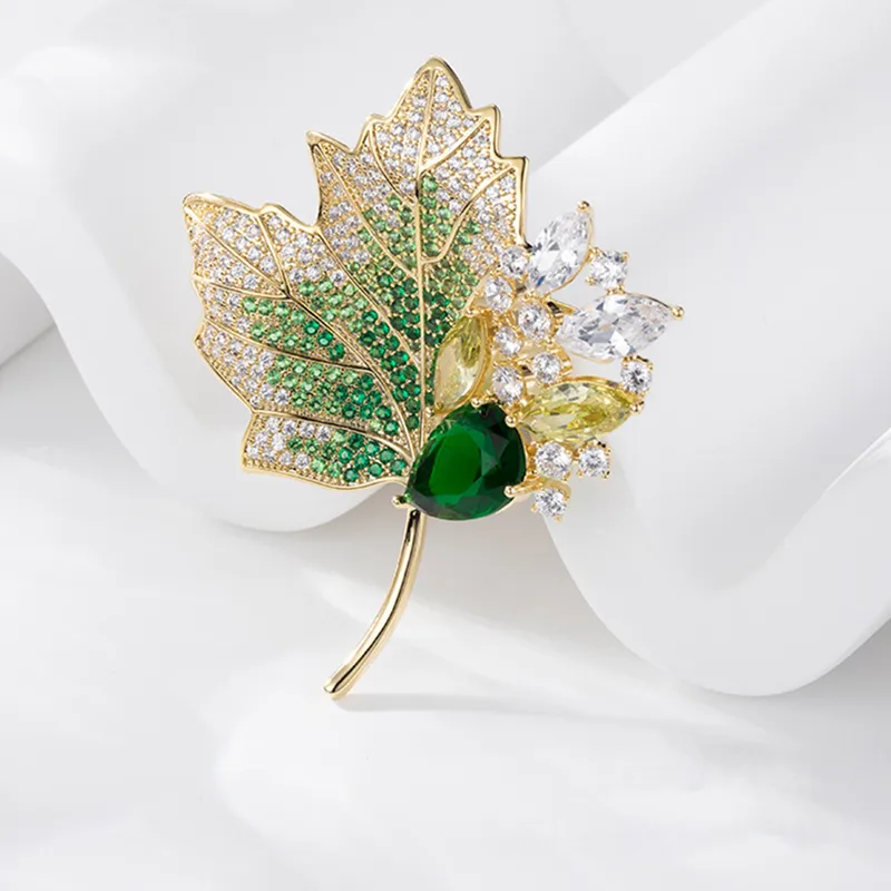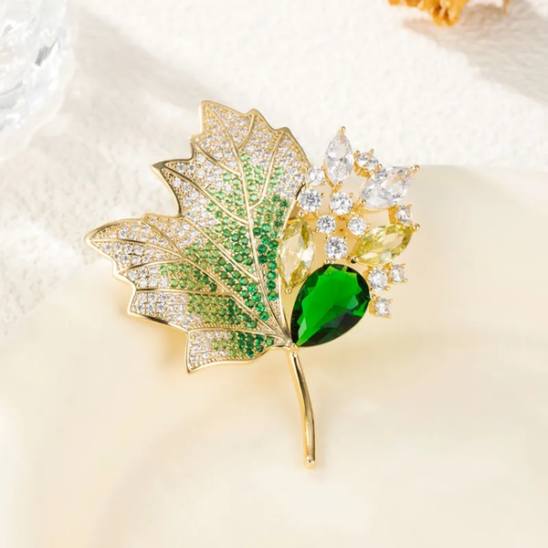 Eine sehr schöne Brosche in Form eines Ahorn Blatt es. Ein grüner Zirkon-Wassertropfen verziert das Blatt. Die Grösse beträgt in der Breite ca 4cm und die Länge ca 5 cm