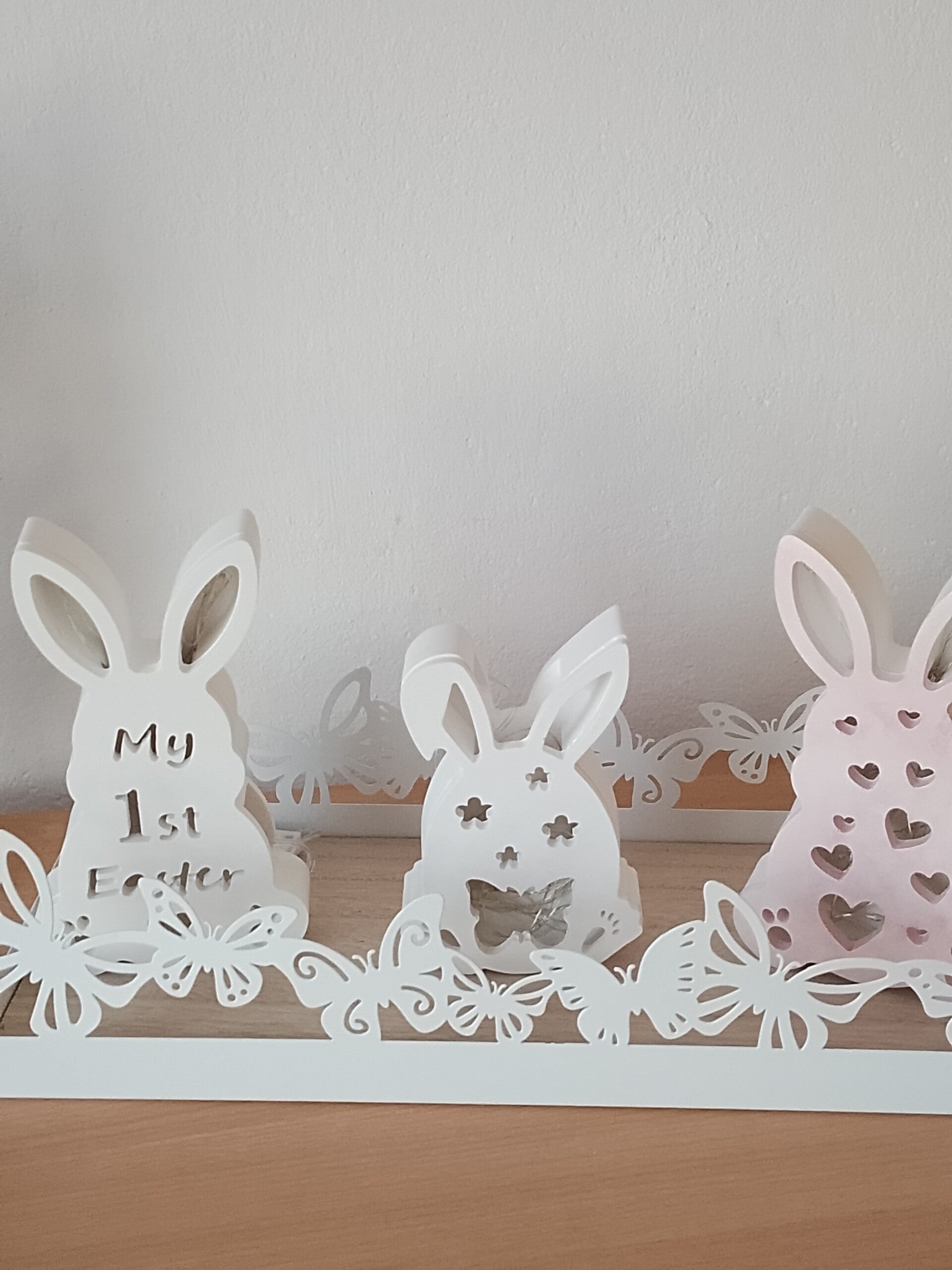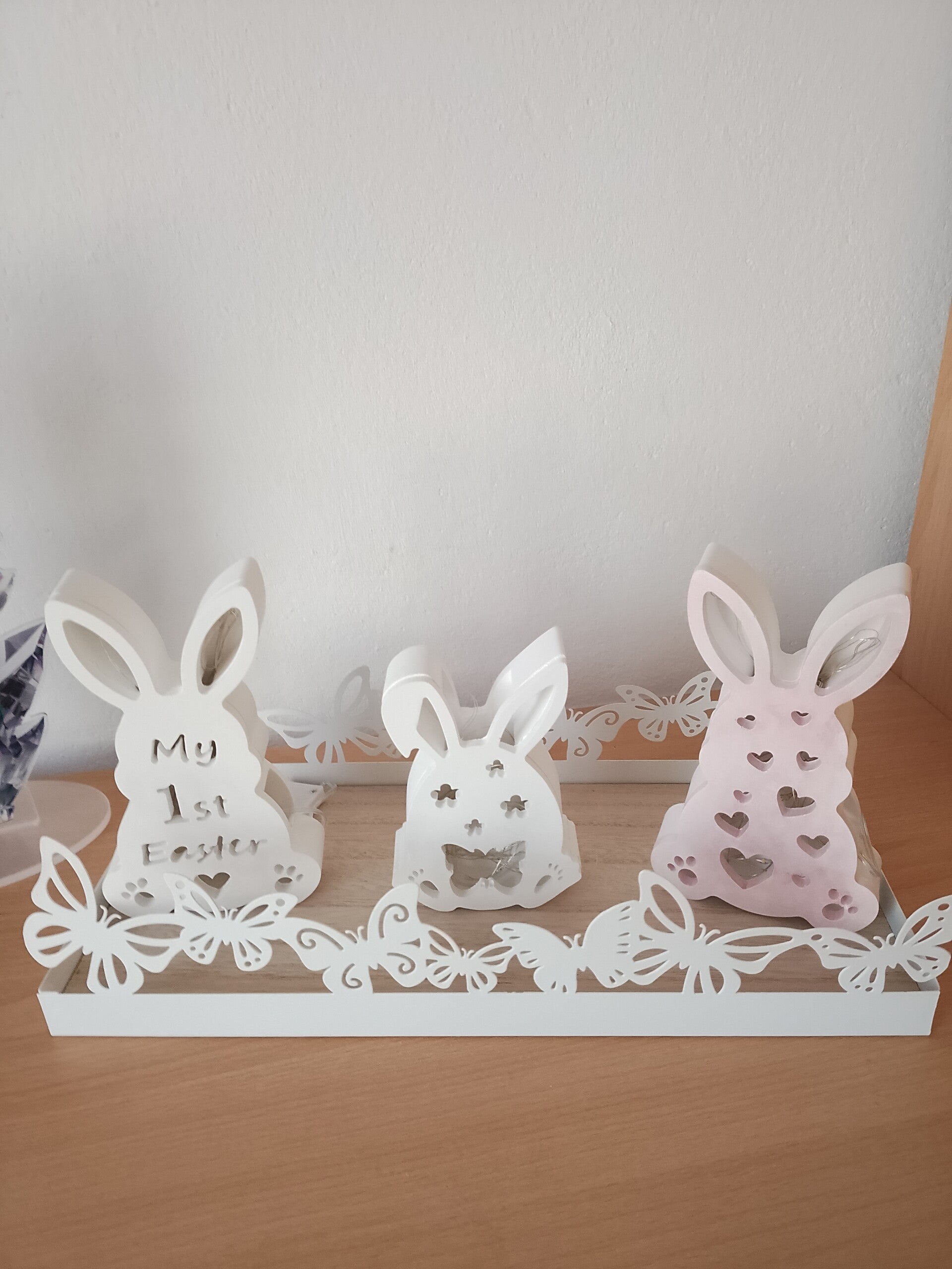 Die Deko- Hasen sind in liebevolle Handarbeit hergestellt. Ihre Größe beträgt:aussen ca13, 5 cm und der mittlere ca 10 cm. Das Tablett selbst ist 30 cm lang und ca 13 cm breit. Die Hasen sind mit Licht.