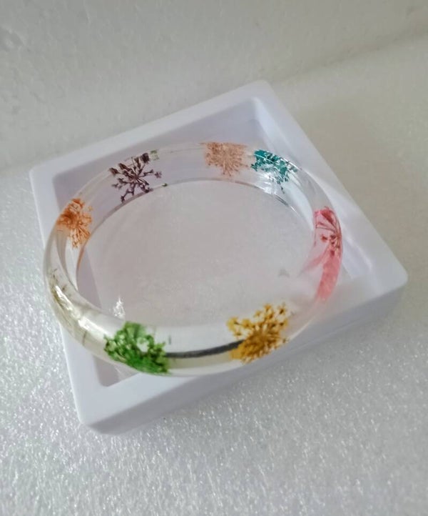 Der Armreif ist aus Harz und hat einen Innen-Durchmesser von ca 6,5 cm. Rundum sind farbenfrohe Blumen. Ein passendes Accessoire für jeden Anlass